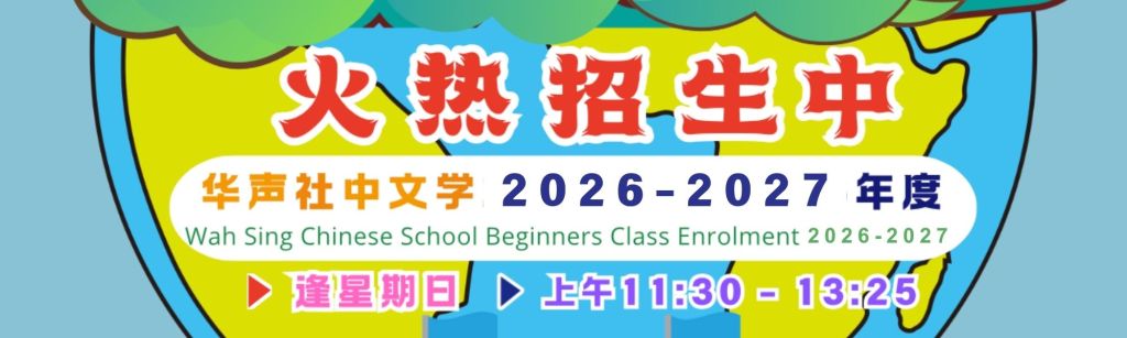 华声社中文学校 2026- 2027年度 上学期于2月8日正式开课。School 1st term starts on 8th February 2026.